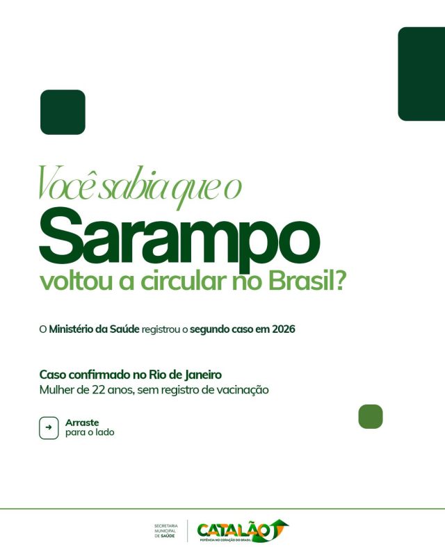 A Prefeitura de Catalão, por meio da Secretaria Municipal de Saúde, emite alerta preventivo a toda a população após a confirmação do segundo caso de sarampo no Brasil em 2026. O novo registro, confirmado pelo Ministério da Saúde no Rio de Janeiro, acende o sinal de alerta para municípios de todo o país devido à alta capacidade de contágio do vírus.